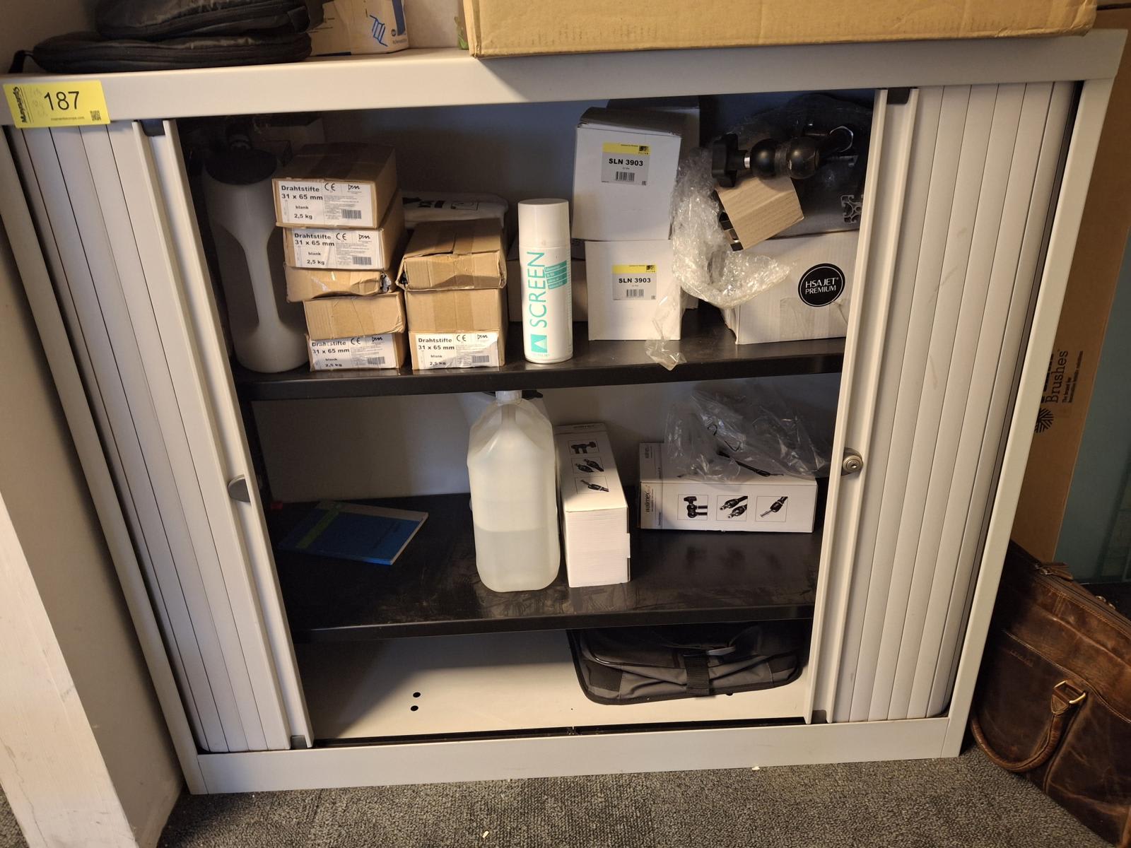 - Skříň s posuvnými dveřmi (s obsahem)Poplatek za vazbu a služby: 100 € (EURO) Obsah zahrnuje: drátěné sponky, různé. Obsah se může lišit.