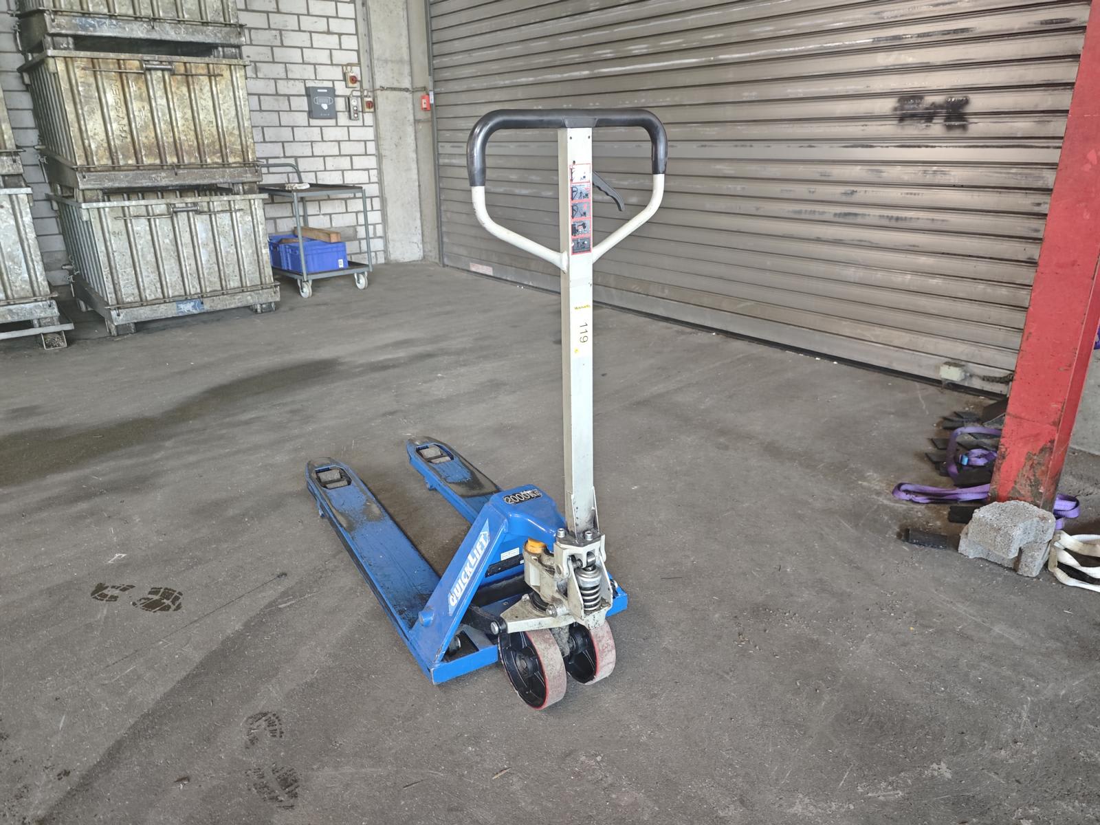 - Palettenhubwagen QUICKLIFT | 2007Gebühr für Entbindung/Handhabung und Verladung: 20 € (EURO) Gebrauchte QUICKLIFT Palettenhubwagen 2007 zu verkaufen, manueller Palettenhubwagen max. 2000 kg mit Gabellänge ca. 1130 mm, Lager- und Fertigungslogistikgeräte aus Industrieauktion