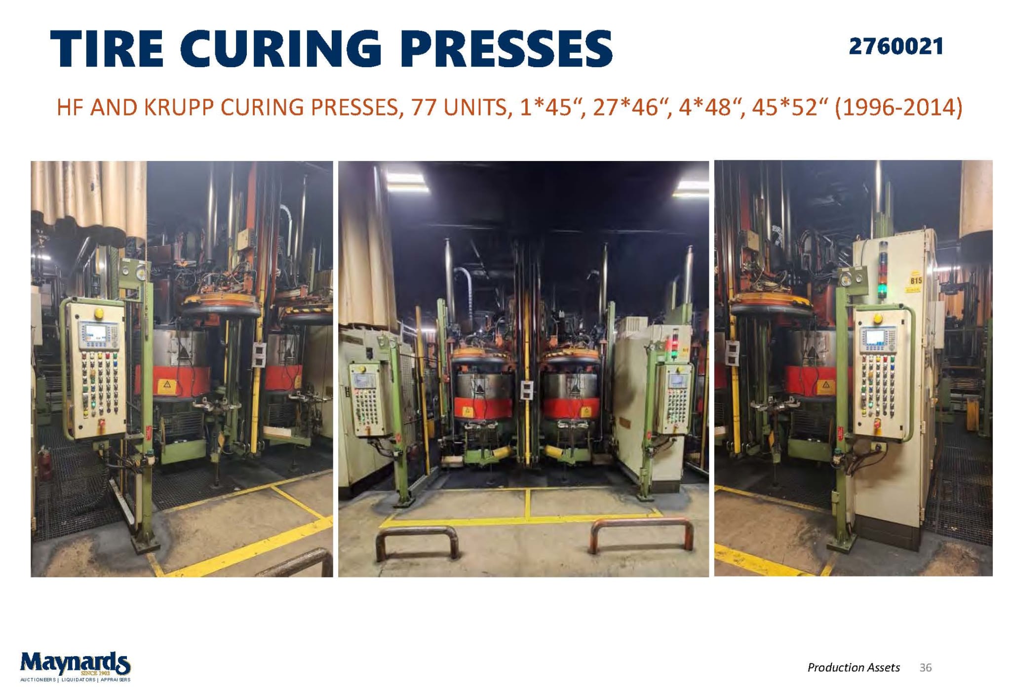 - (77) Hydraulic Tire Curing Presses Krupp & Haburg Freudenberger | 1996-2021HYDRAULIC CURING PRESSES, 77 UNITS, 45“, 46“, 48“, 52“ (1996-2021) incl. Unloader/Uploader, PSI Stands, Control Units